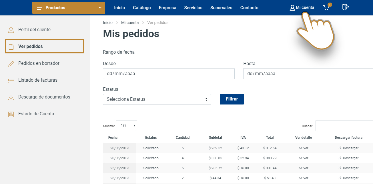 Desde 'Mi cuenta' puedes consultar todos los pedidos que hayas realizado y el estatus en el que se encuentran; además puedes ver tus pedidos en borrador, facturas y Estado de cuenta.