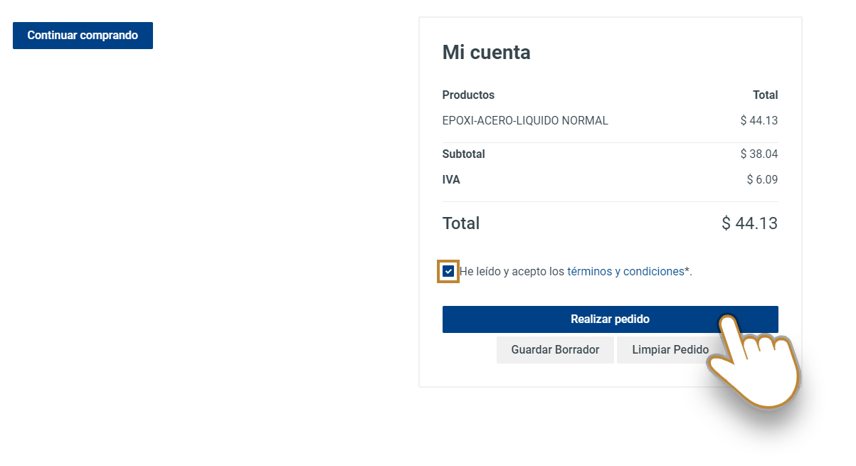 Una vez conforme con tu orden, realiza el pedido. Para guardar tu orden y poder modificarla posteriormente, haz click en 'Guardar Borrador'. Si deseas, puedes también limpiar el pedido y comenzar de nuevo.